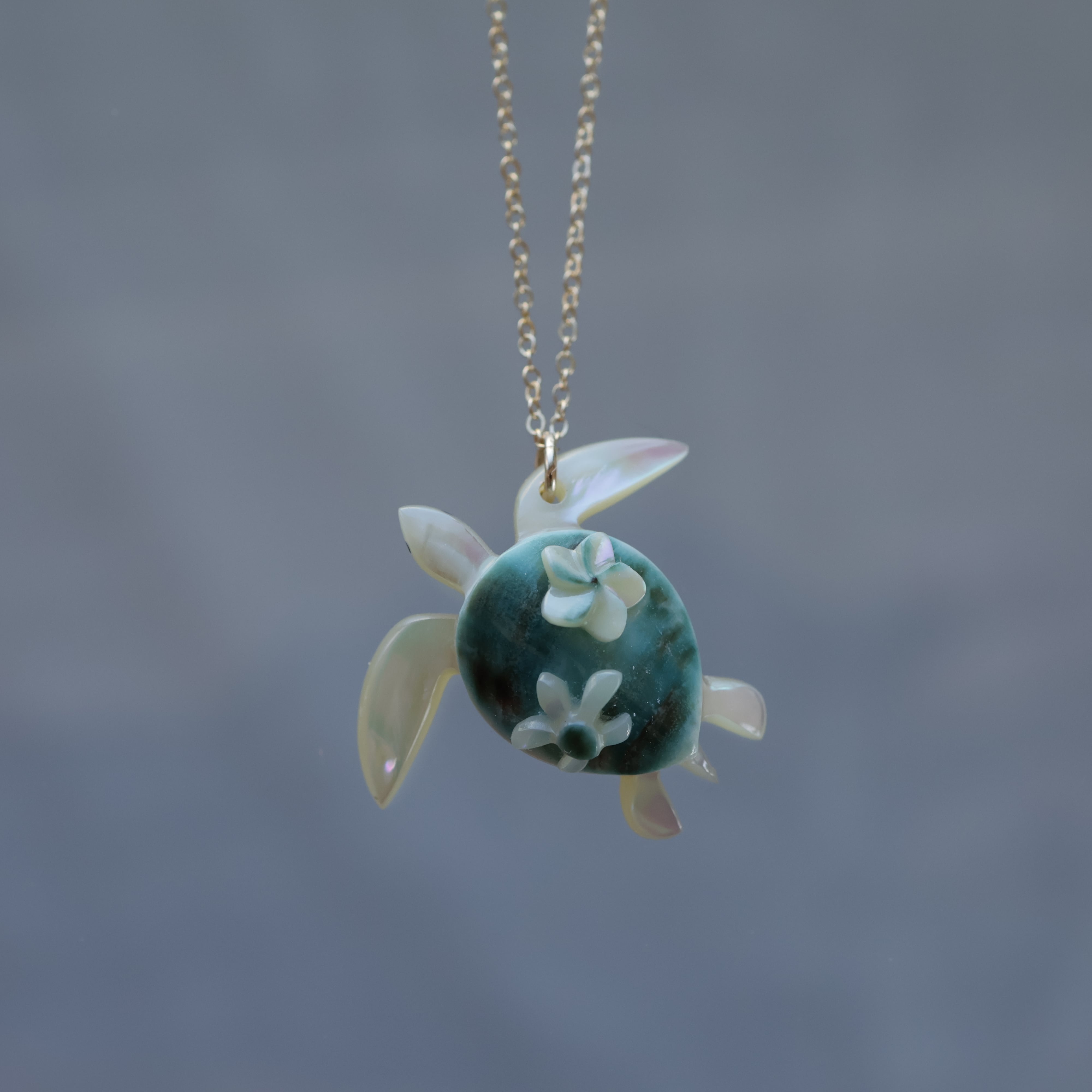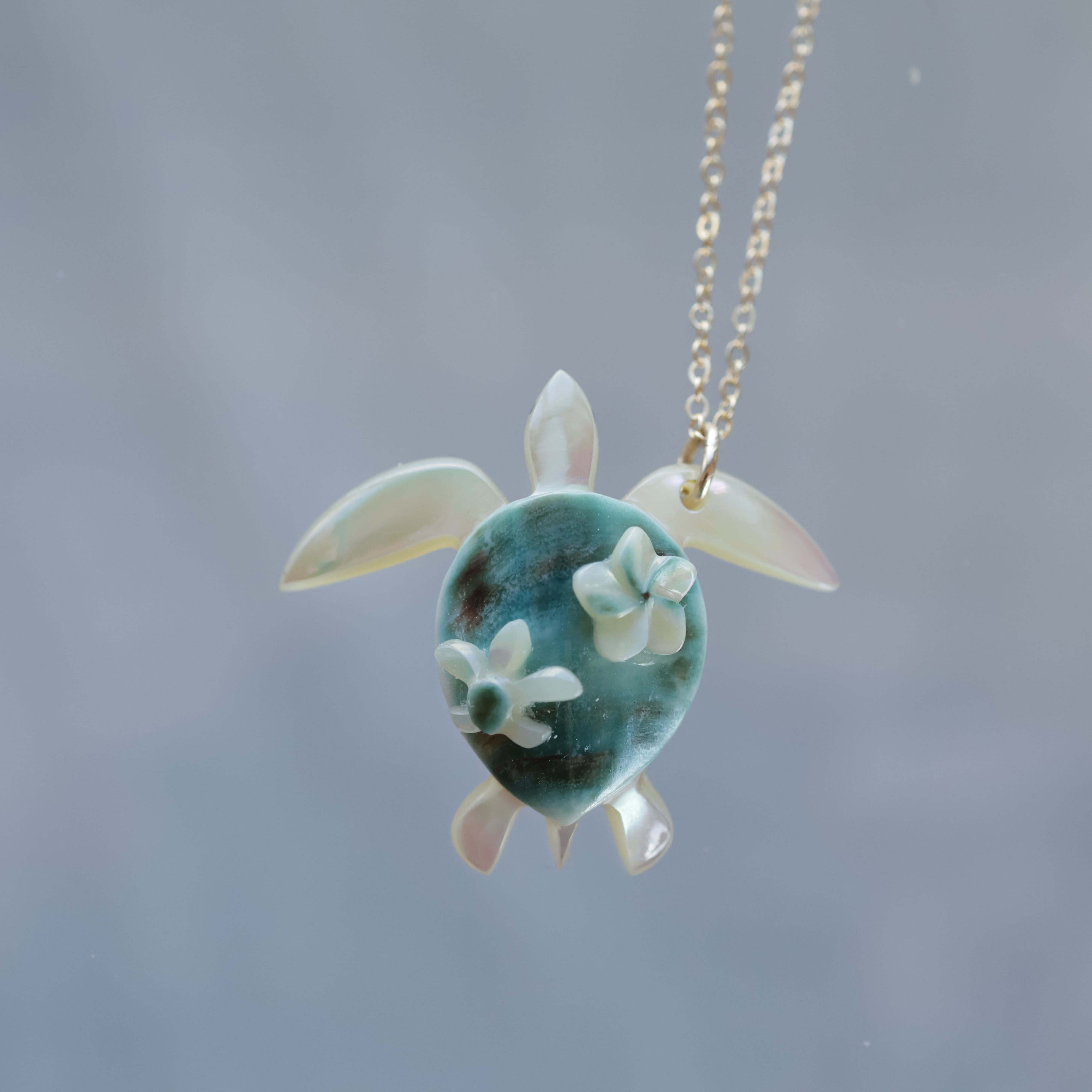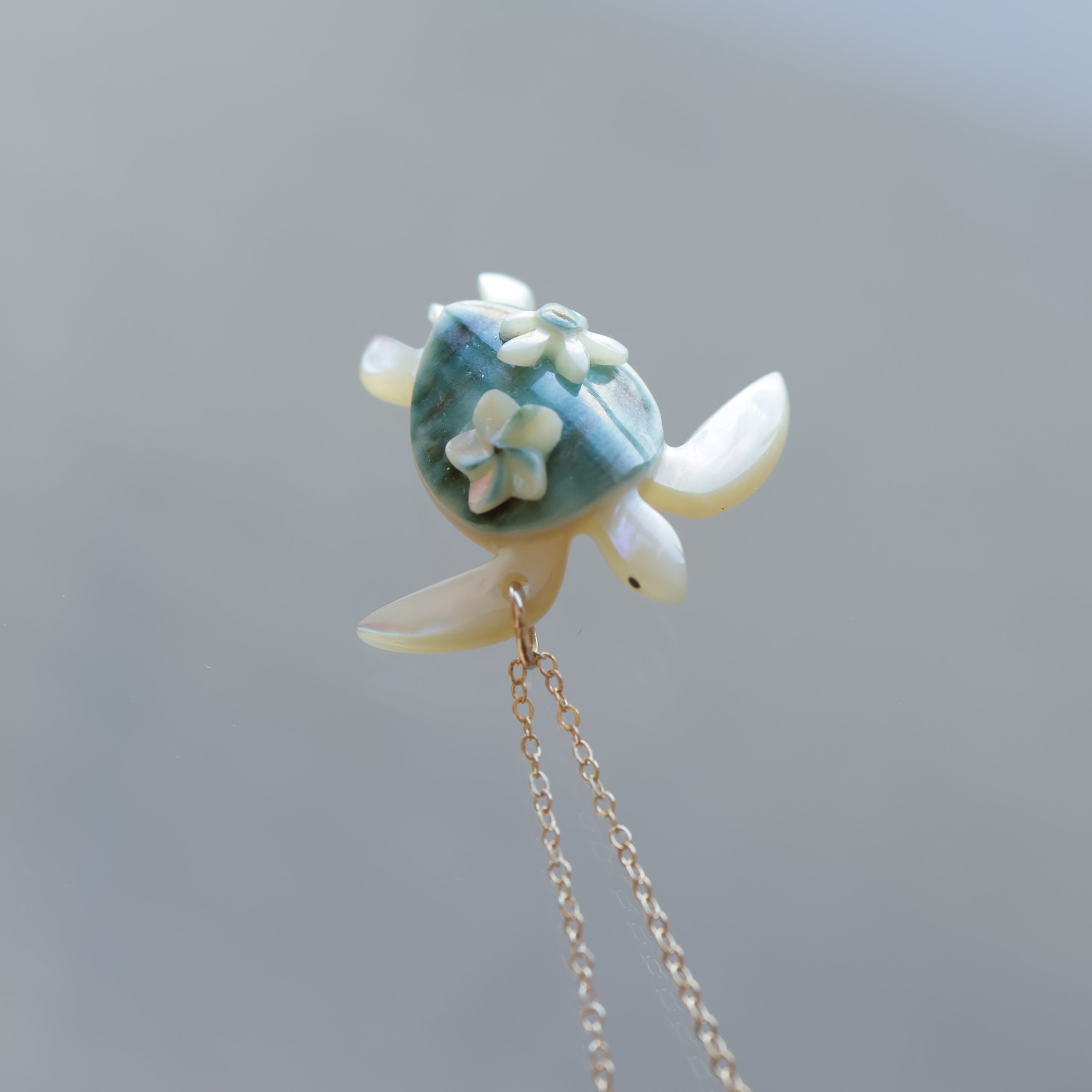 【受注作品】夜光貝 プルメリアと小亀おんぶの海亀