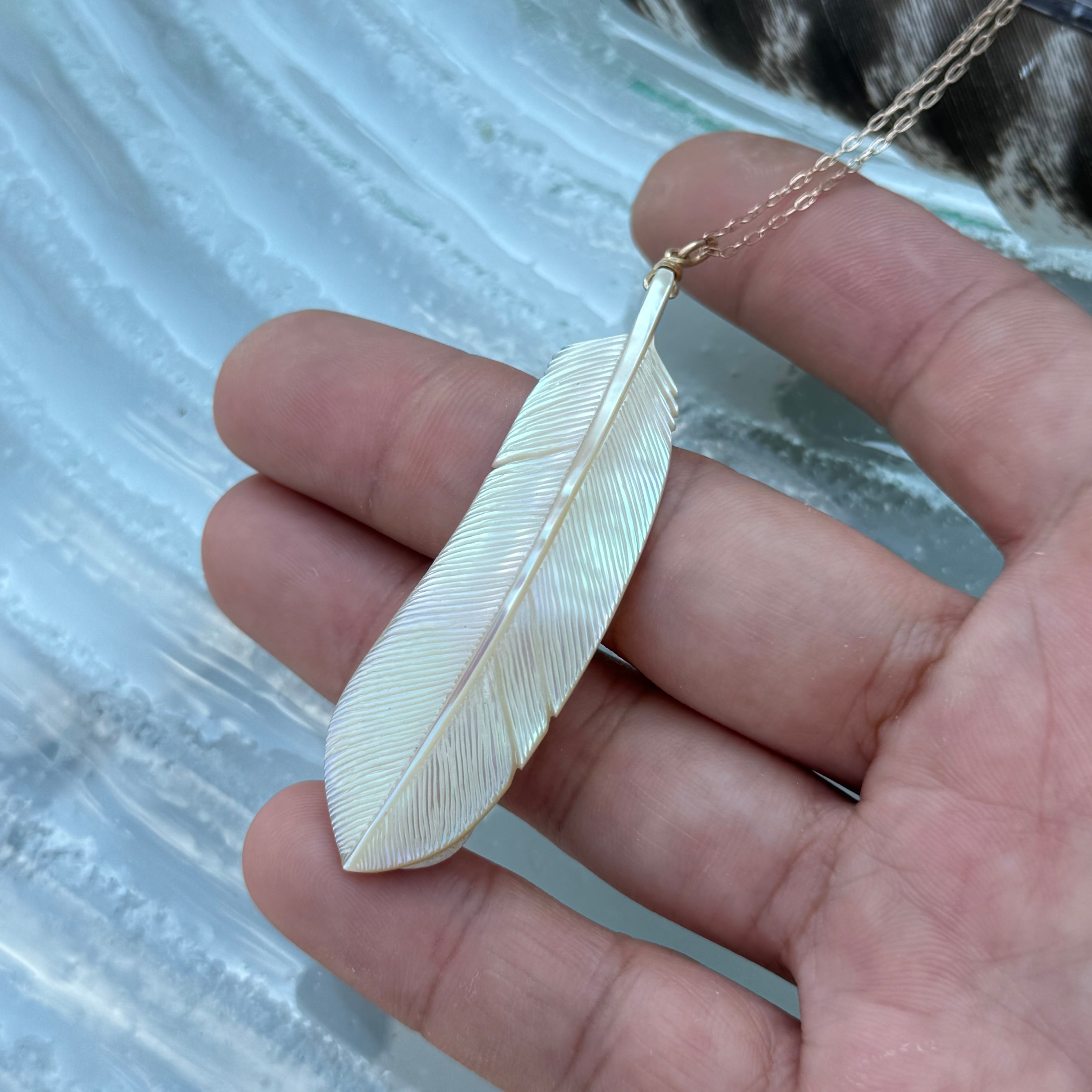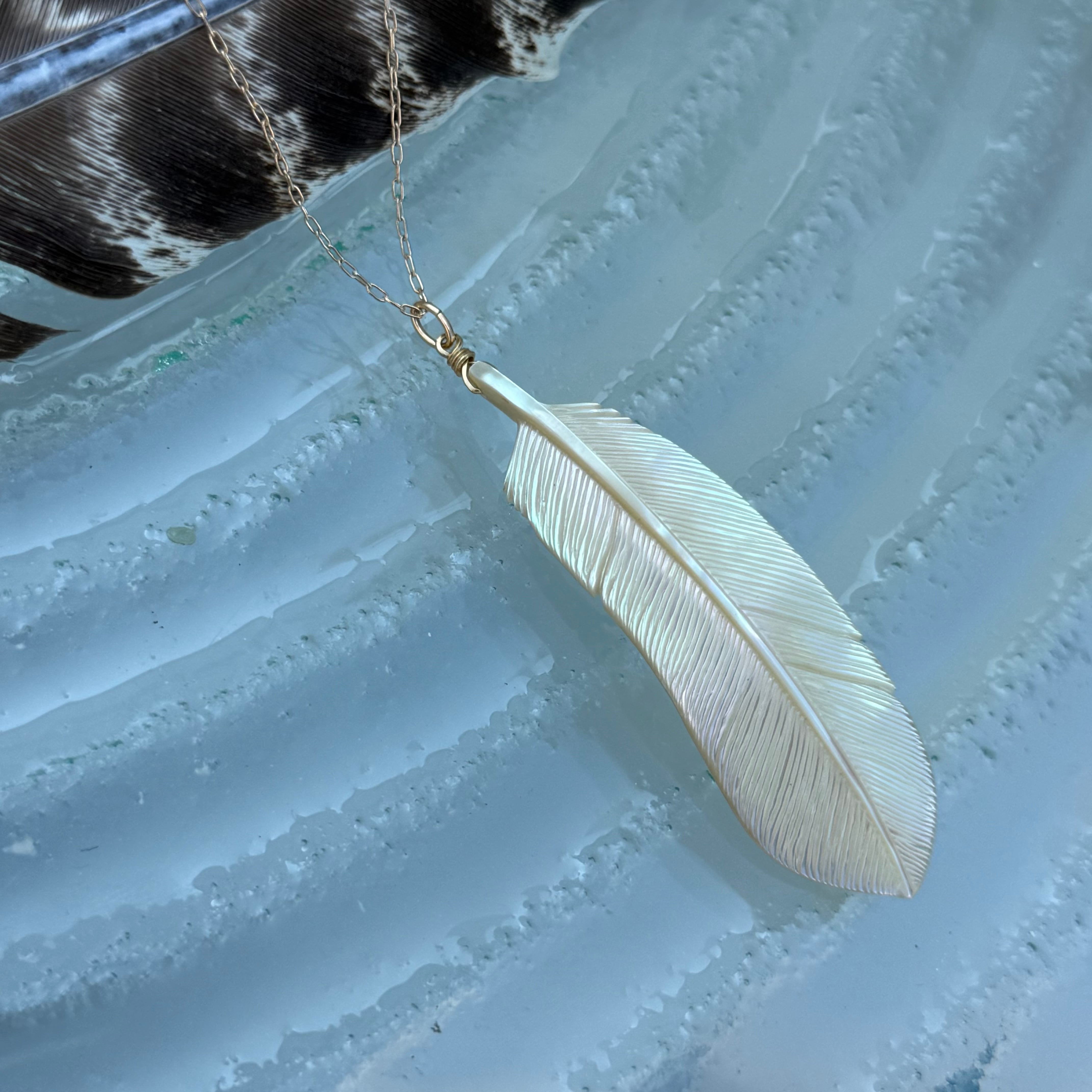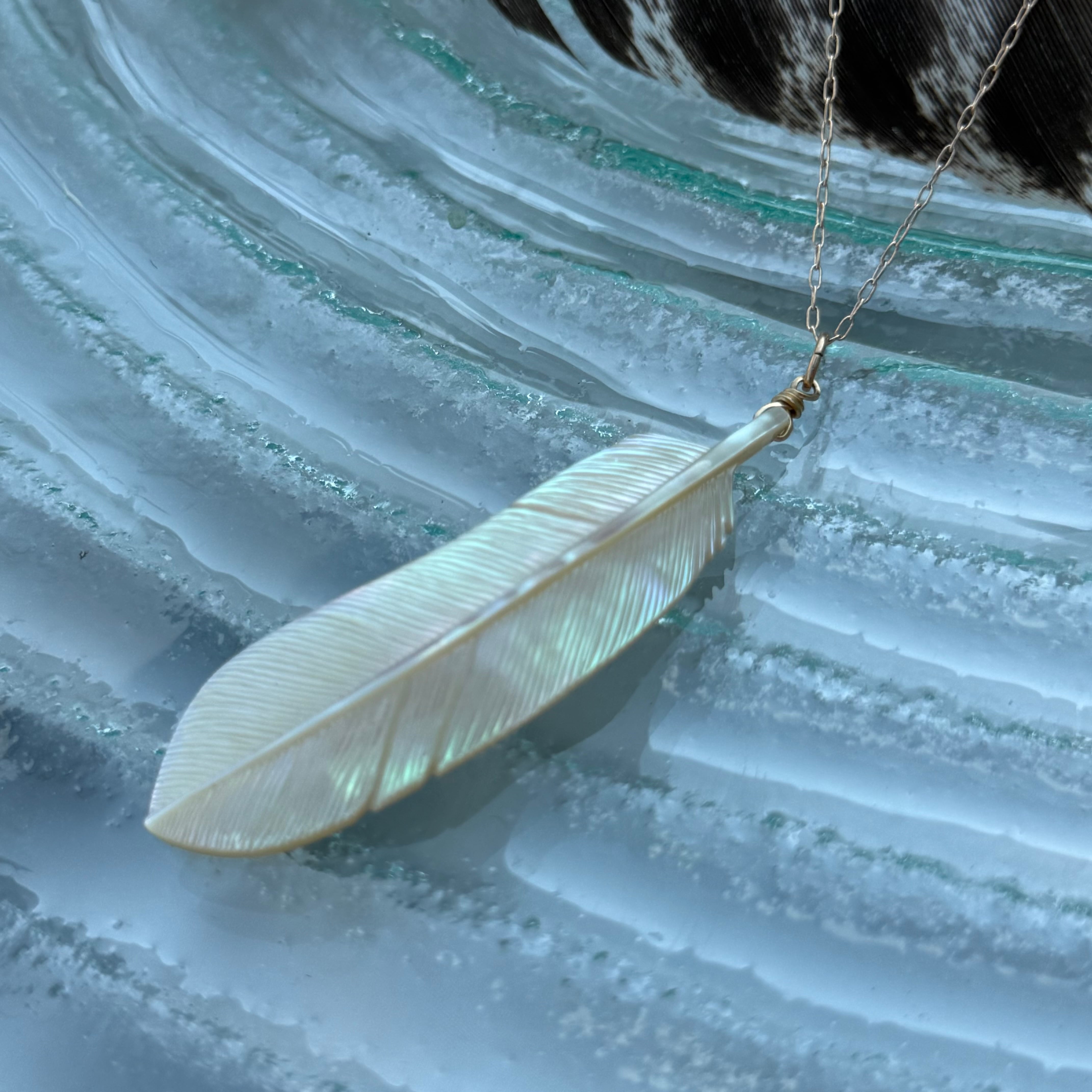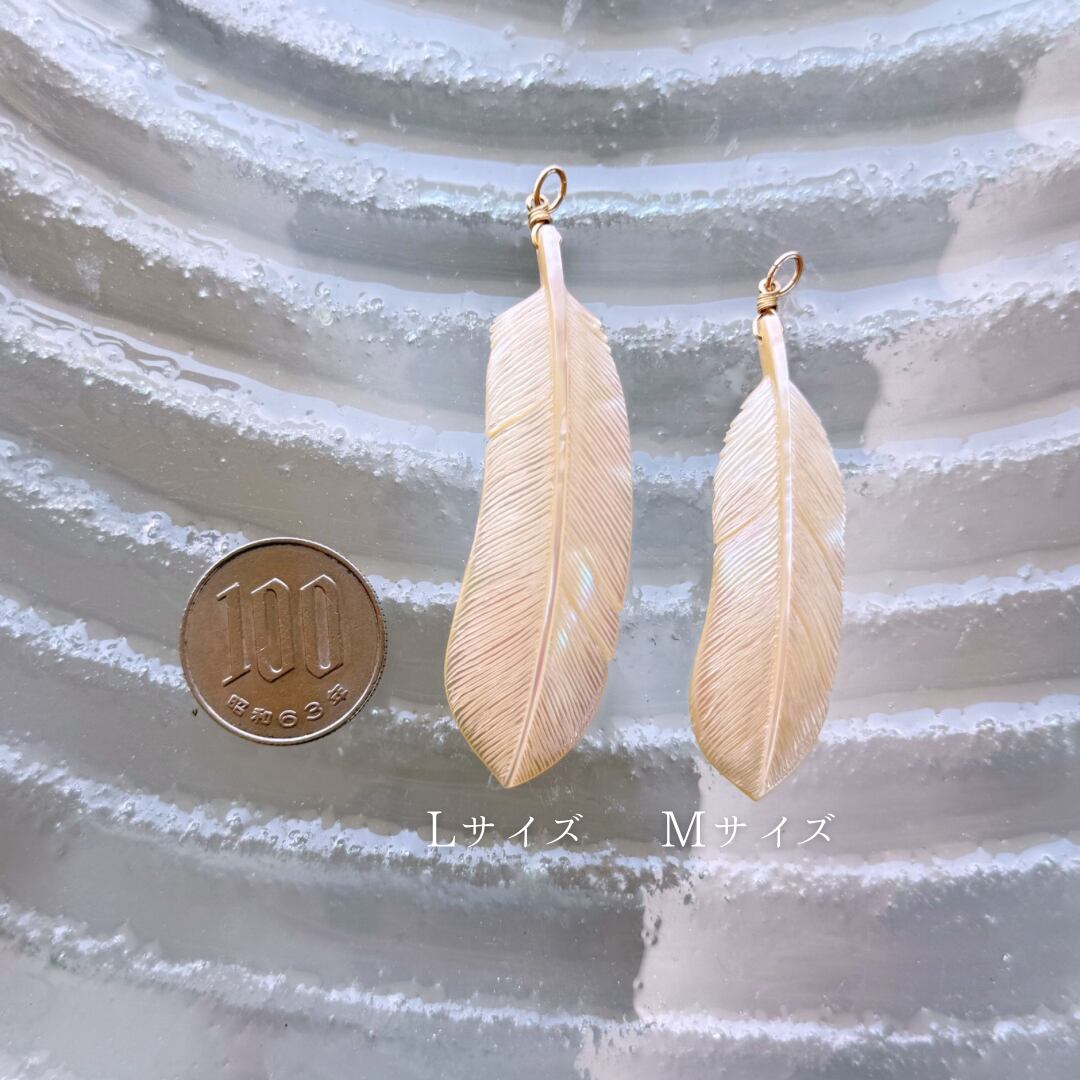 夜光貝の真珠層から羽根のフェザーを作りました。